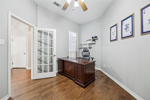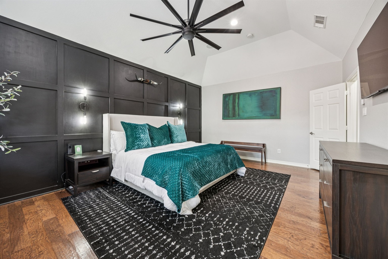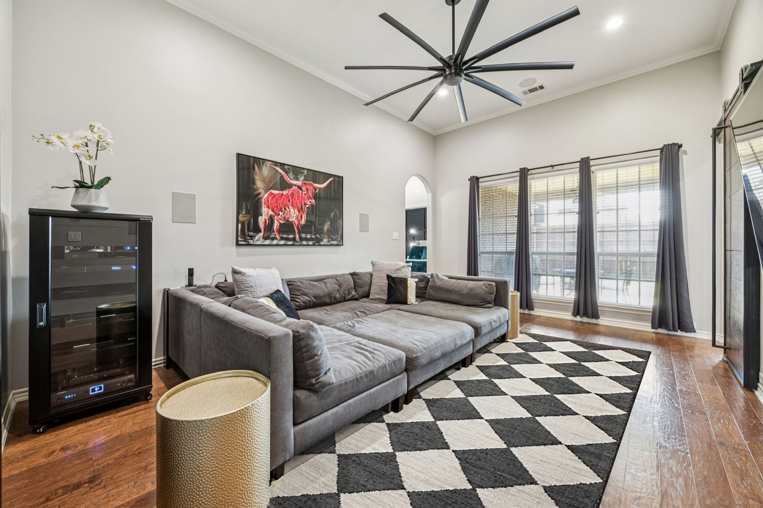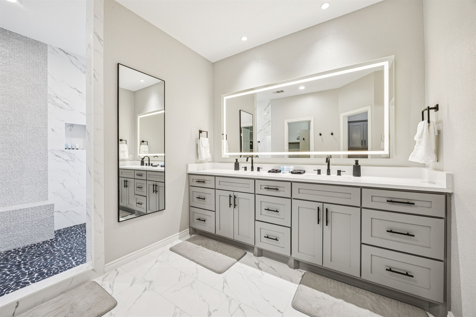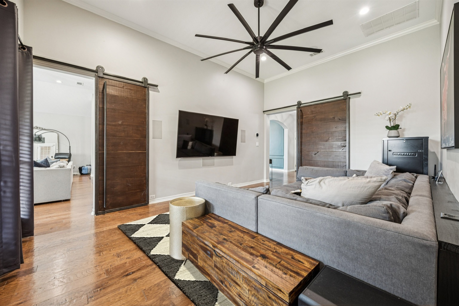 Custom barn doors separate the media room from the foyer and the living room. The media room leads into the primary suite secluded away from the rest of the home, with spa-like amenities and space for both rest and rejuvenation—including a double rainhead shower, dog-washing station, and dual vanities.
