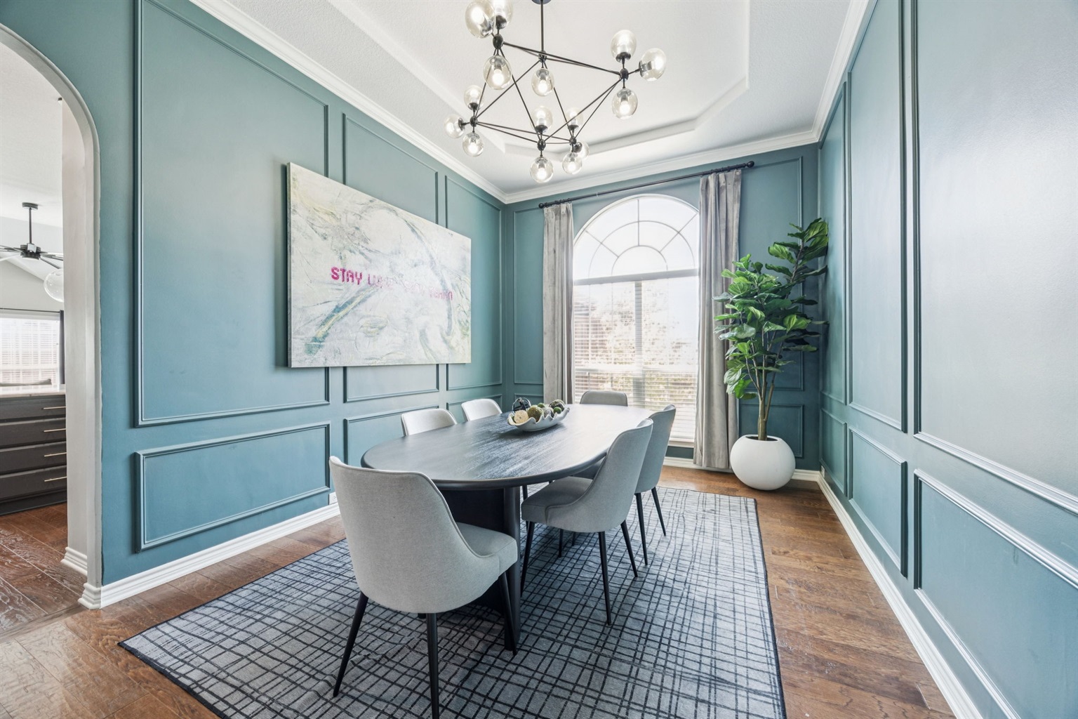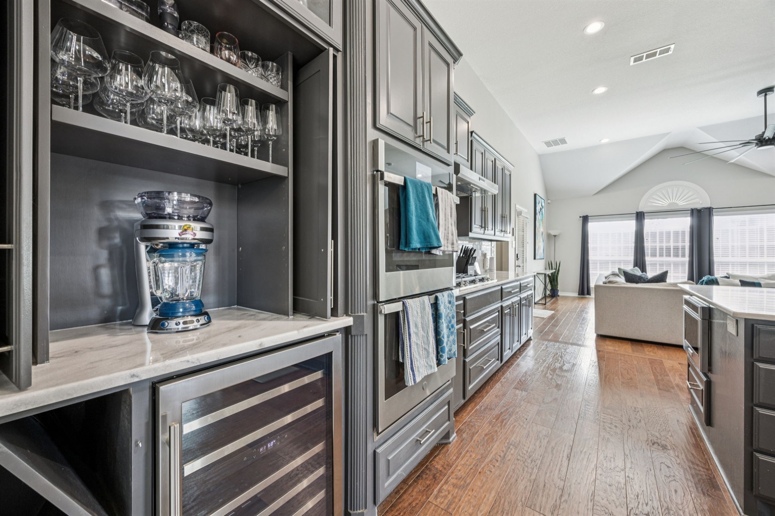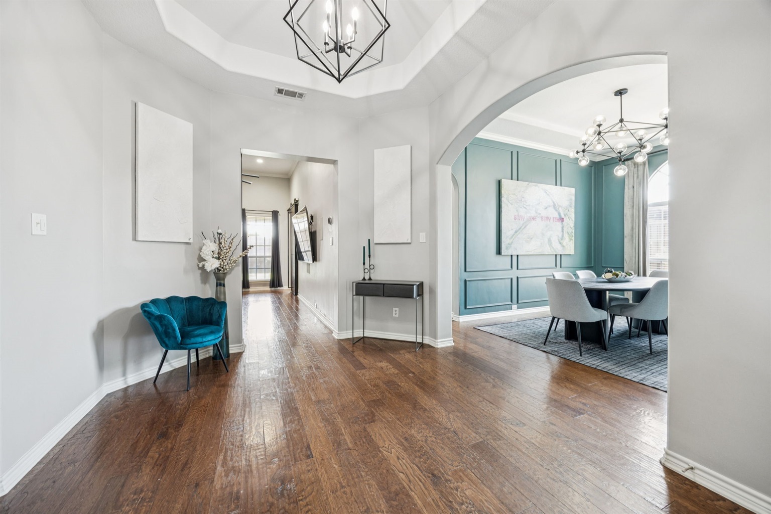 Step through the front door into a grand entryway framed by 15-foot ceilings and an inviting open layout. To the right, a stylish dining room leads into the gourmet kitchen—complete with an oversized island that seats six, modern appliances, and direct access to the poolside patio.