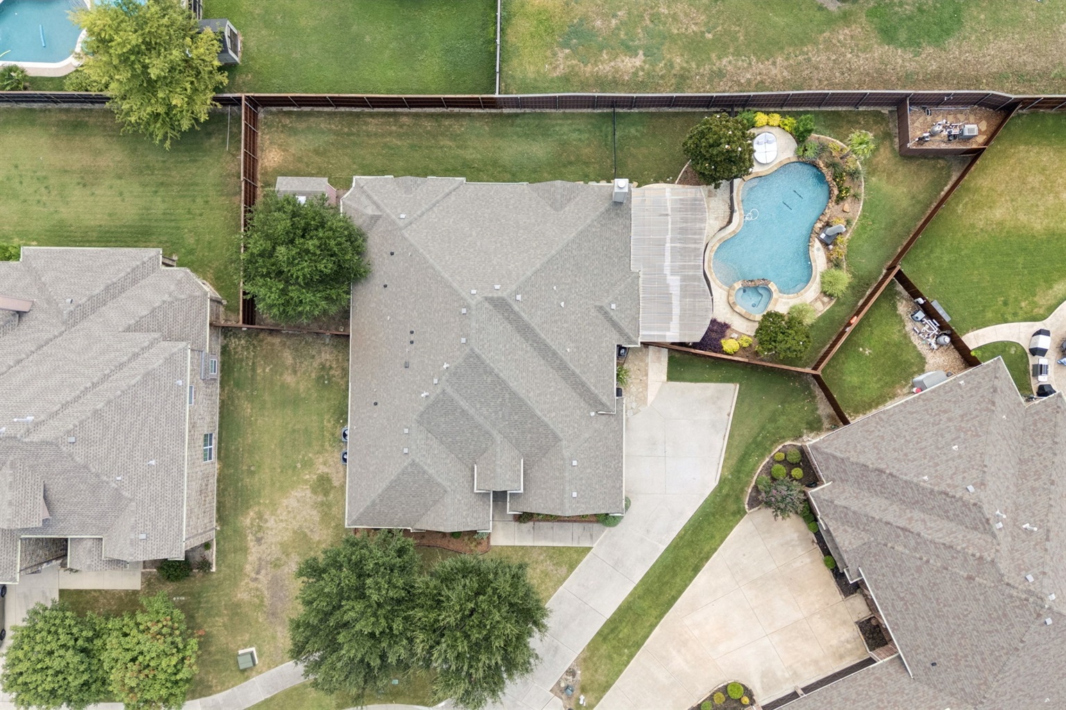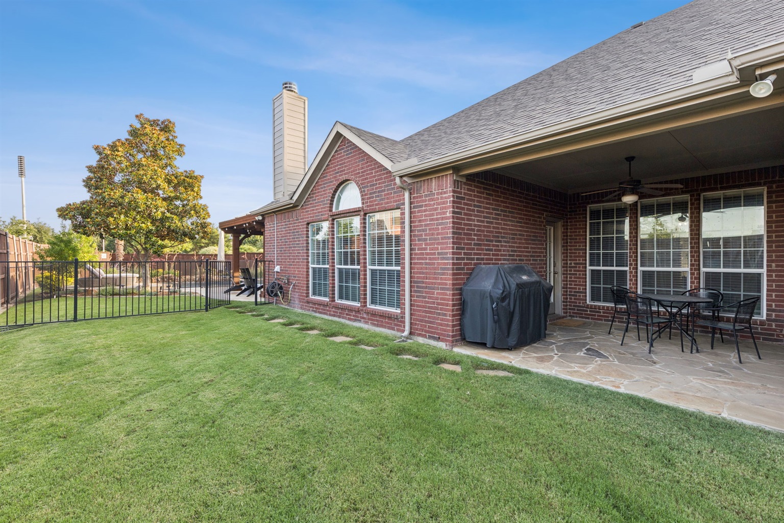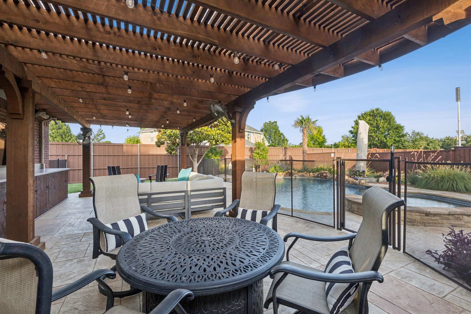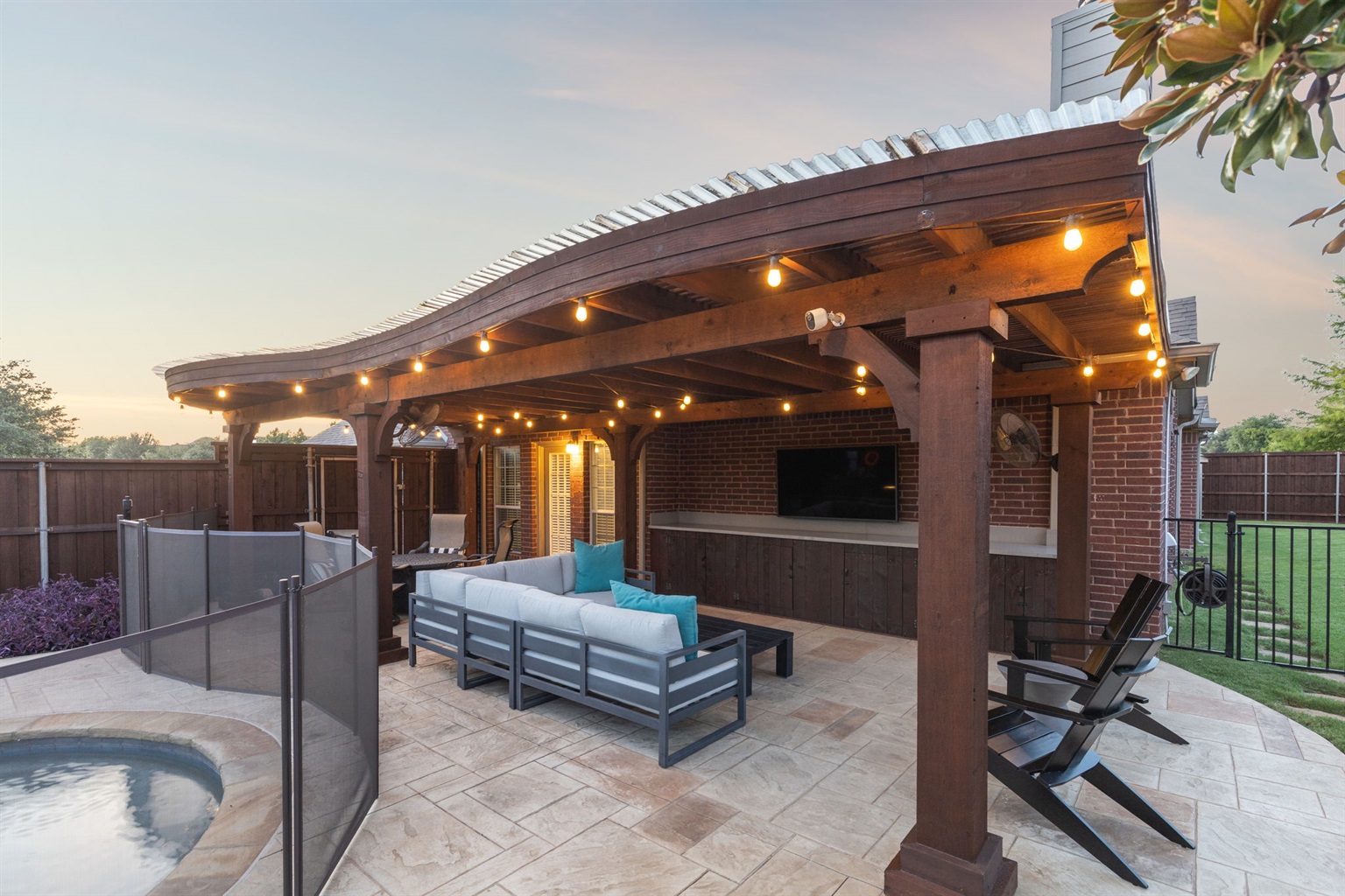 Enjoy resort-style amenities in your own backyard. A sprawling covered pergola shades an outdoor sectional, firepit table, and a high-brightness 65” outdoor TV with full surround audio. The pool and spa area is tucked privately on one side of the house, while the rear yard opens to a fully fenced grassy lawn—perfect for pets or outdoor games. The dedicated dog run ensures your pup has room to roam safely while you unwind in comfort.