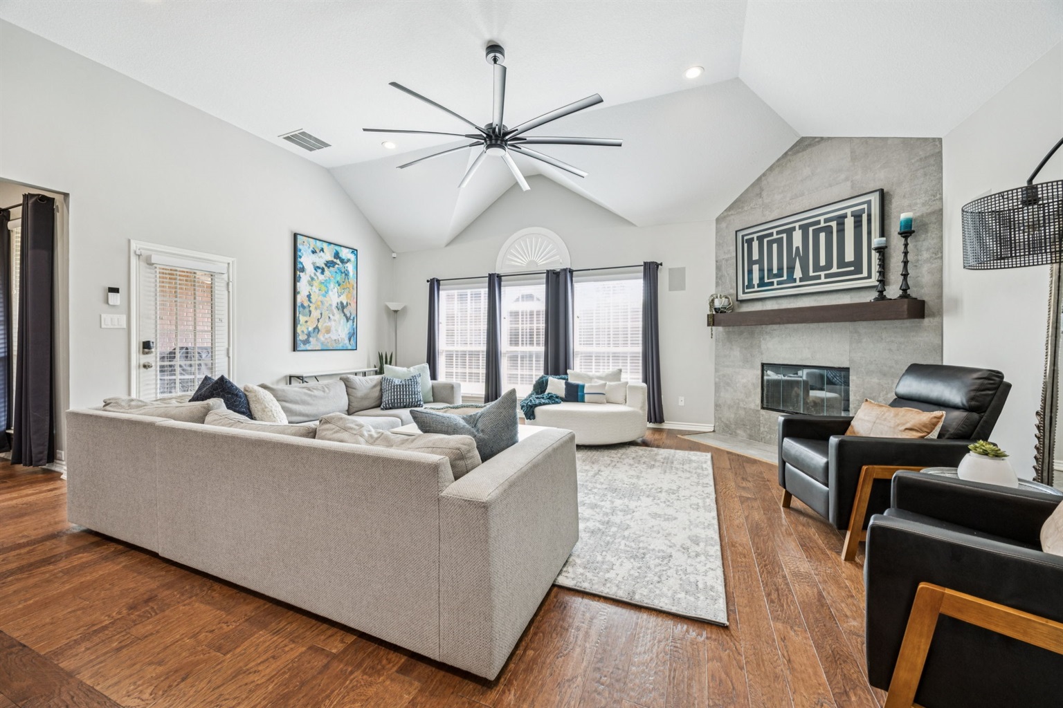 Flow into the cozy living room featuring a 65" Smart Frame TV with custom The Luxe Longhorn-themed art. Nearby, a door opens onto the back patio, where a grill and a large grassy yard with a gated dog run await.