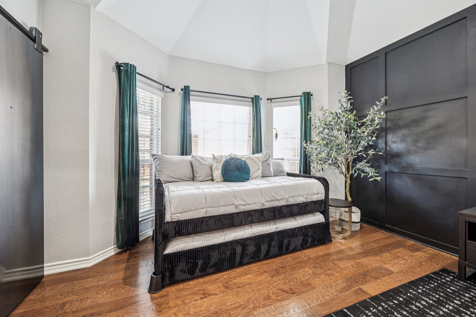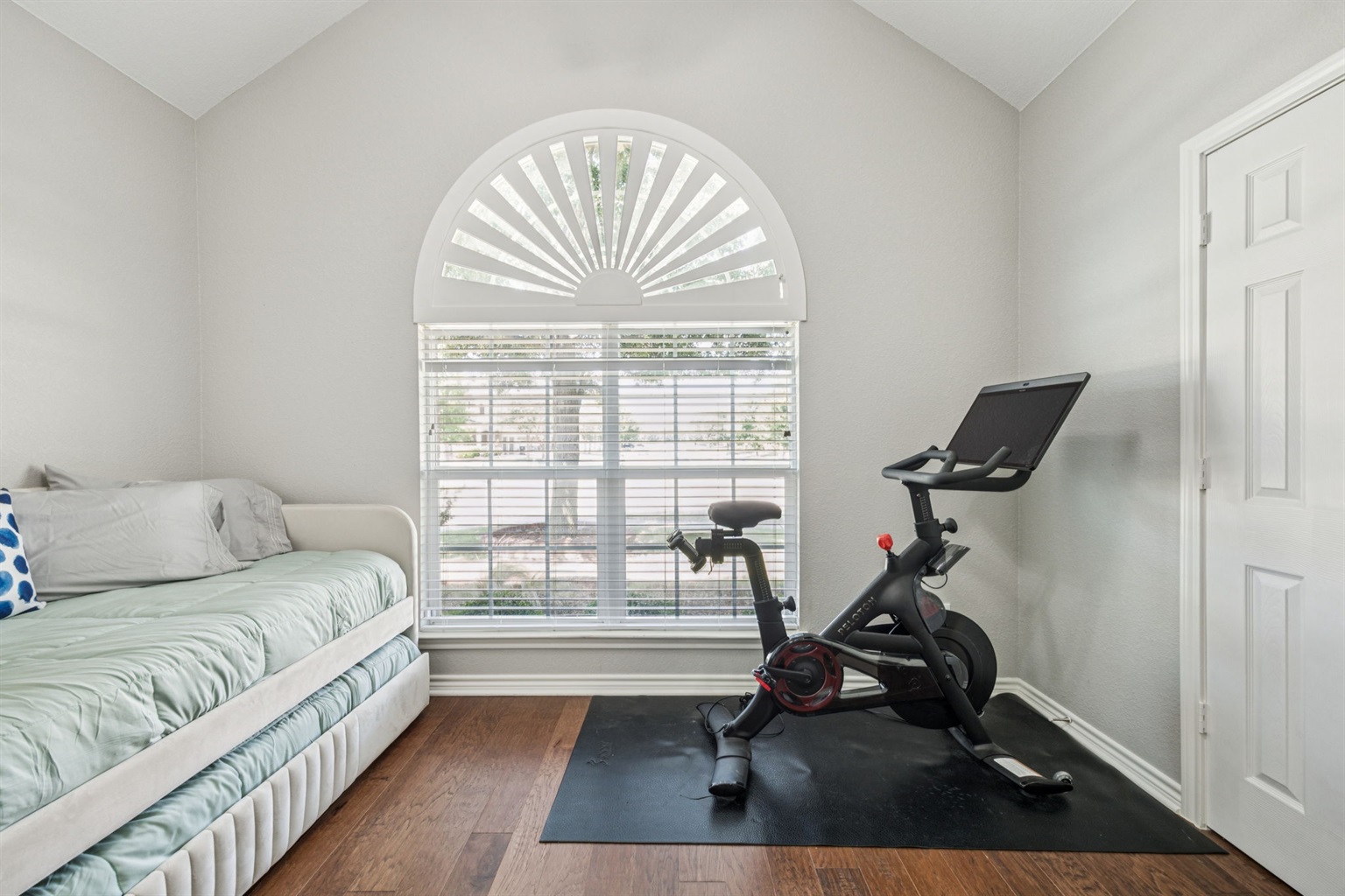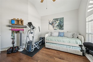 Down the left hallway, you’ll find the three front bedrooms, including a fitness-focused room with Peloton exercise bike, Precor elliptical machine, Bowflex Select-Tech dumbbell set, exercise bands, yoga mat, and a twin trundle bed-ideal—ideal for guests wanting to stay active.