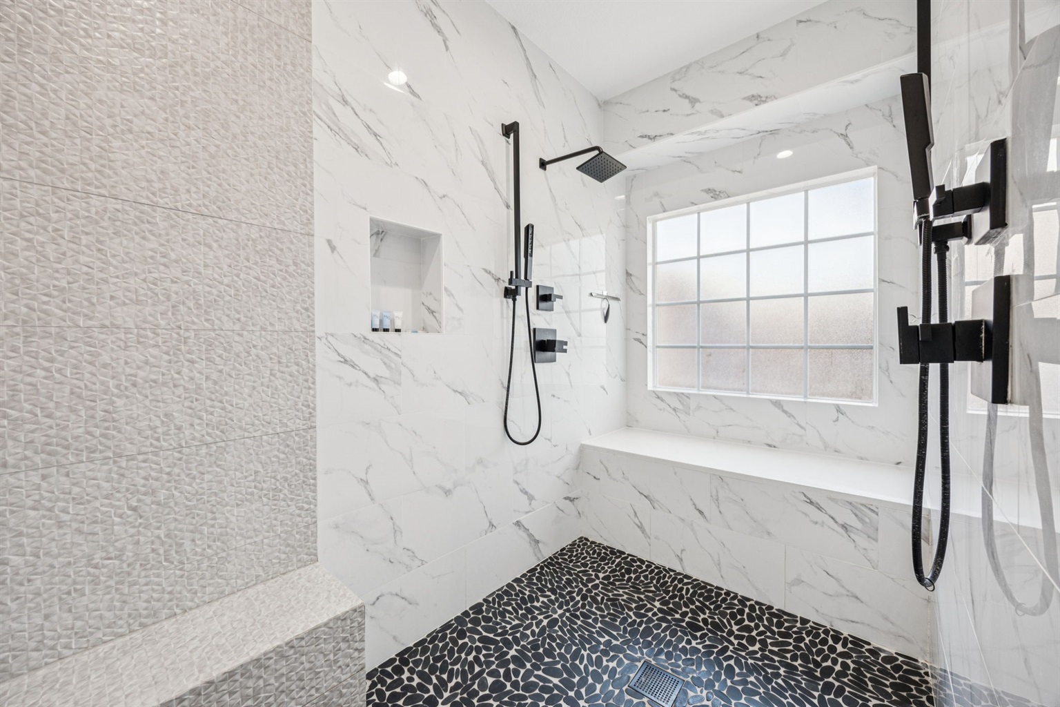Spa-style ensuite with dual rain showers, dog washing bench, and double vanity